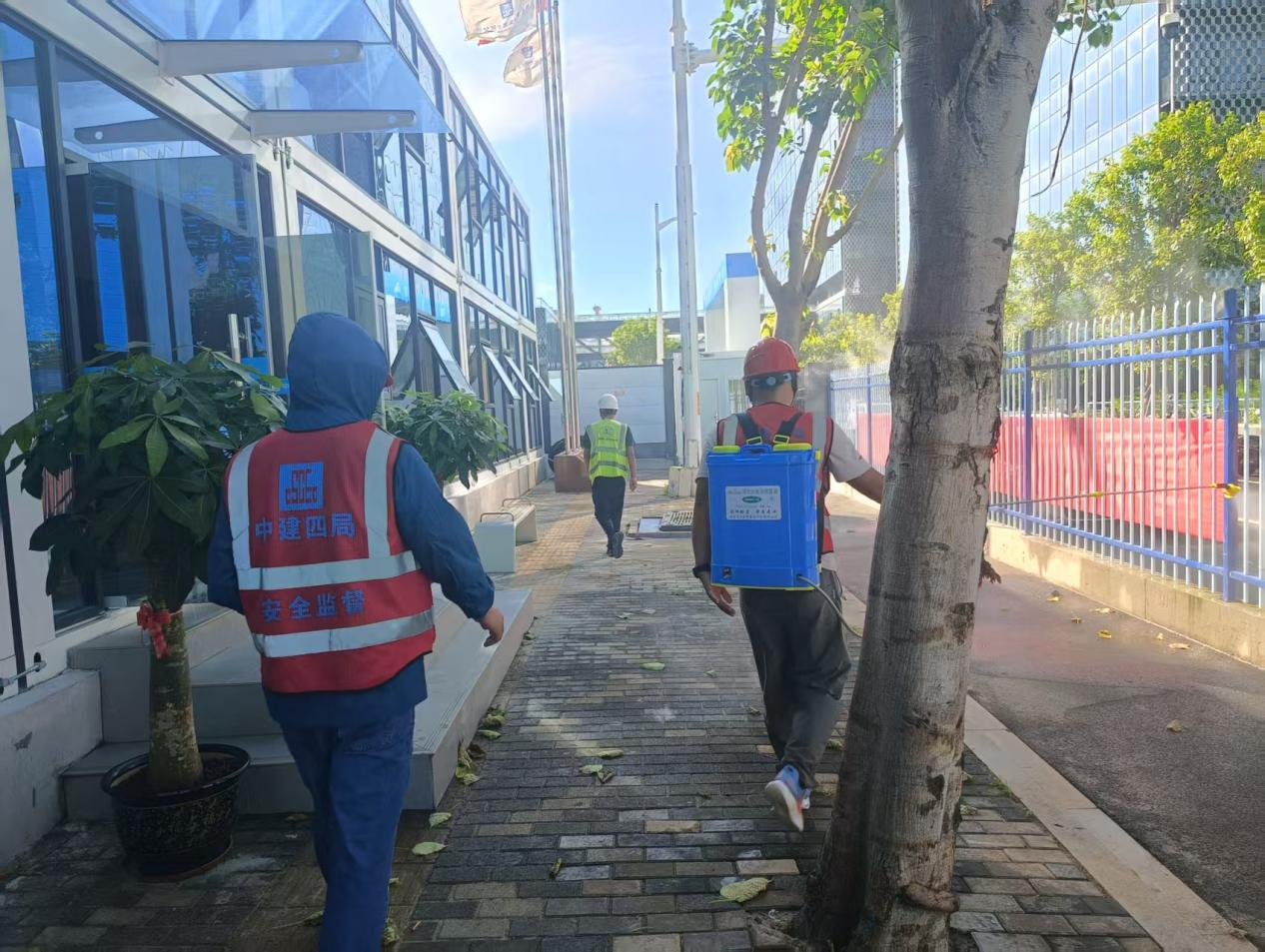 辦公室的內外空間、辦公區前后的綠植叢、工程洗輪機的車輛出入口、臨時休息區的自動售賣機周邊、材料堆放區、臨時衛生間以及周邊綠植、積水洼地等蚊蟲易孳生區域,均被列為重點消殺目標。專業消殺人員嚴格遵循衛生防疫規范,選用高效、低毒的環境友好型藥劑,通過精準噴灑與科學煙熏等復合手段,對蚊蟲棲息及繁殖的核心區域實施了深度消殺,顯著降低蚊蟲密度,從源頭切斷疾病傳播鏈。